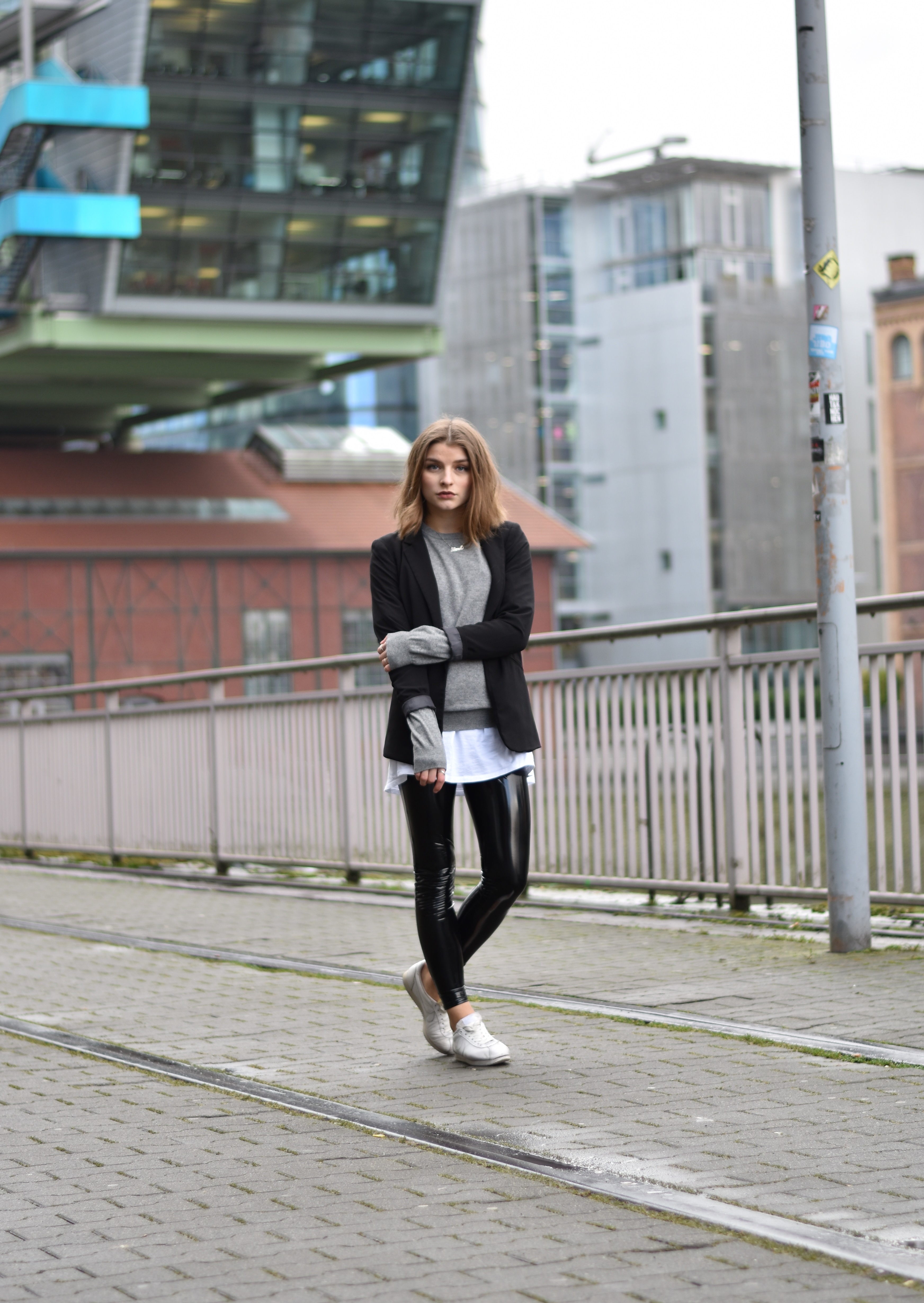 Crew Member Lara liebt es schlicht: Sie schichtet ein weißes Shirt, einen grauen Pullover und einen schwarzen Blazer übereinander. Doch der Look wäre nicht von Lara, wenn es nicht mindestens einen Blickfang gäbe. Ihre Vinyl-Hose übernimmt den Job und bringt Glanz in das Outfit.