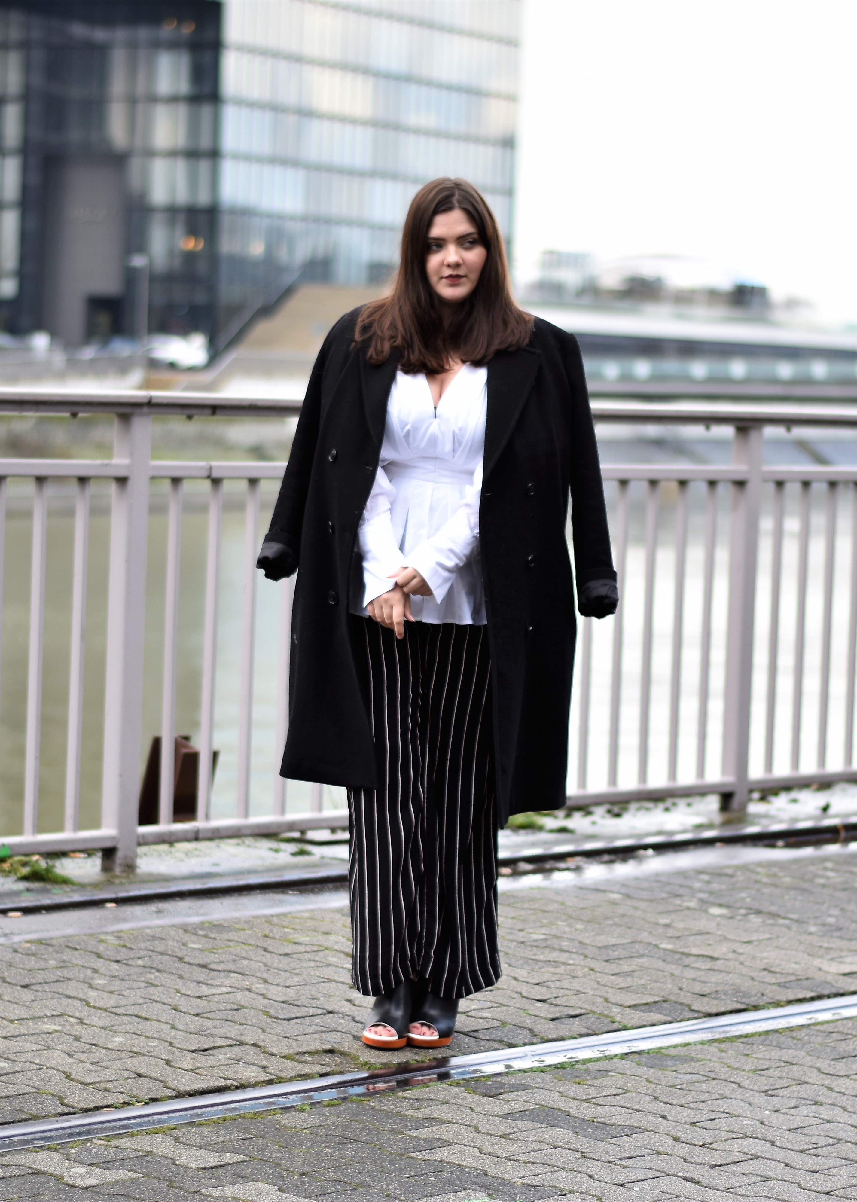 Crew Member Franzi beweist ihr Trendbewusstsein mit einem schicken Schwarz-Weiß Look. Sie kombiniert eine elegante Nadelstreifenhose zur weißen Bluse und schwarzem Mantel. Die Peeptoes mit orangener Sohle sind dabei das einzig farbige Detail.