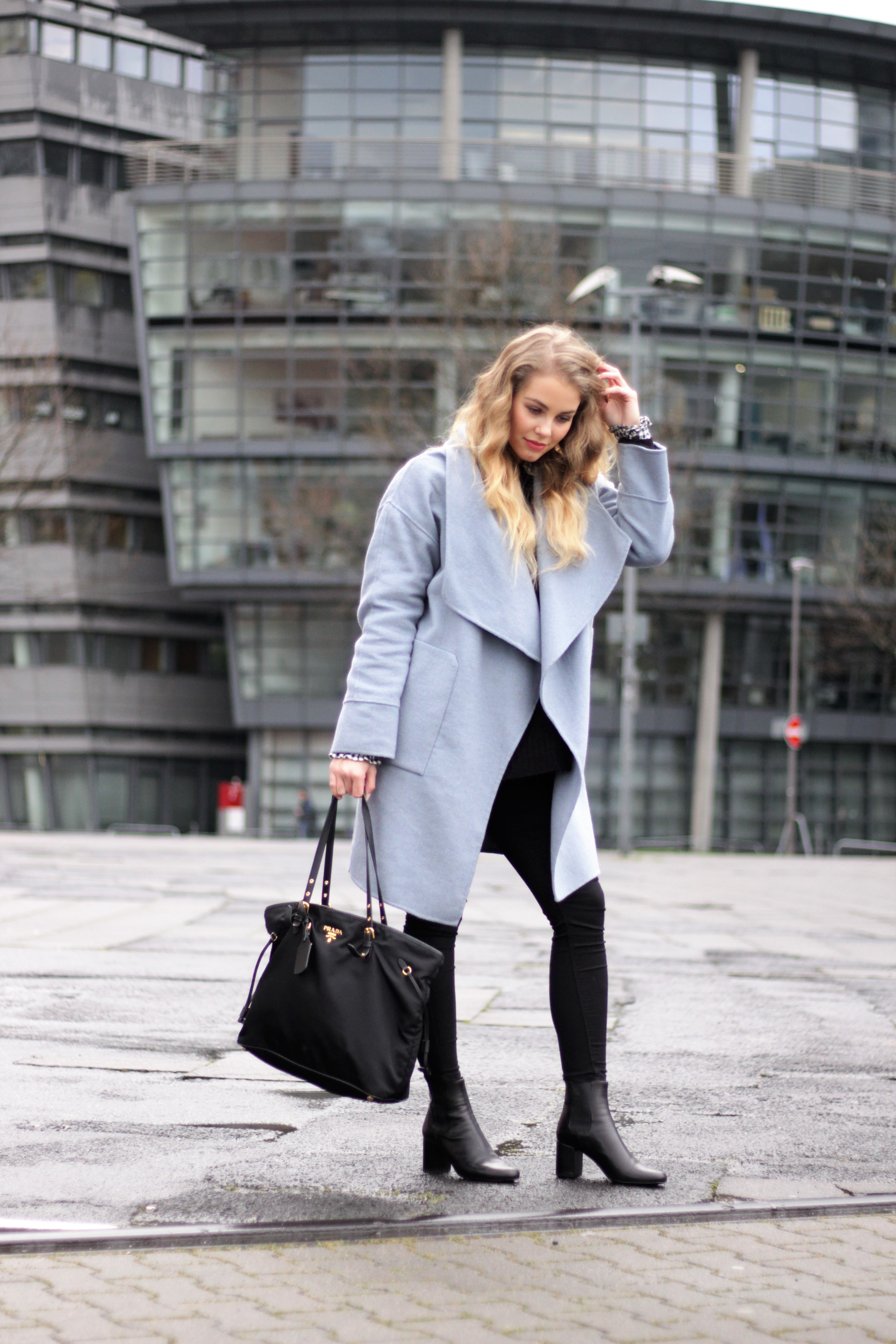 Crew Member Kathrin weiß genau, was ein perfektes Outfit für einen Shoppingtag in der Stadt ausmacht. Skinny Jeans kombiniert zu einem hellblauen kuschligen Mantel, dazu eine große Shopper Bag und Ankle Boots mit breitem Absatz, um lange unterwegs sein zu können.