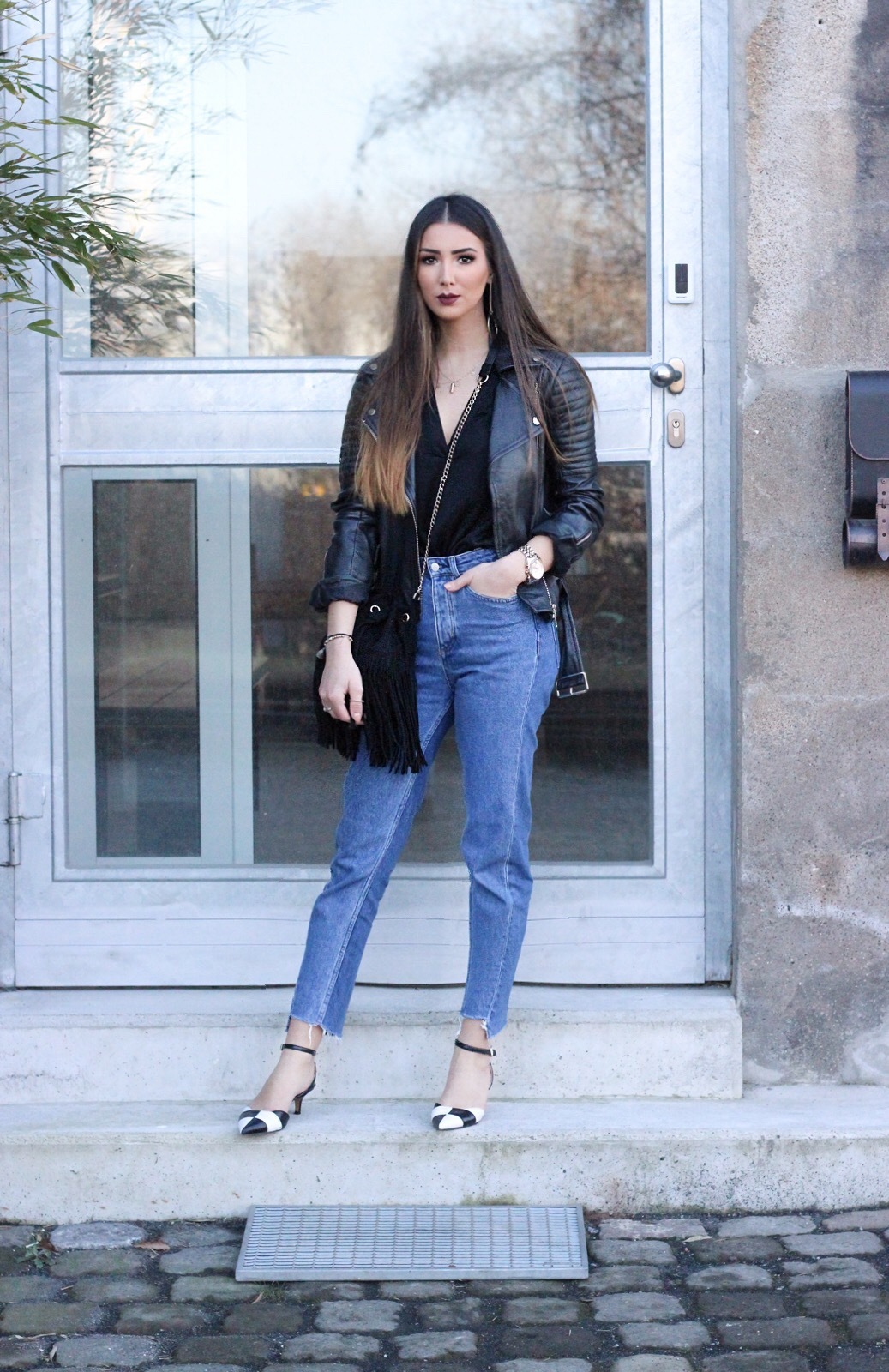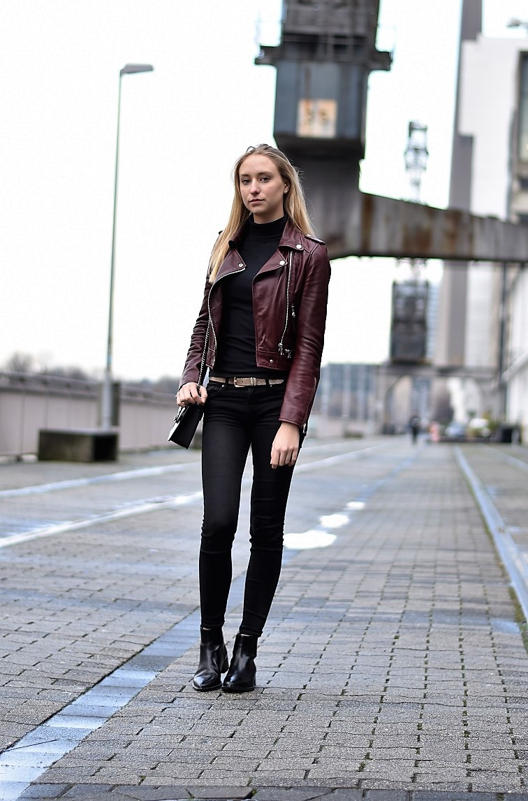 So gut wie jeder von uns hat mindestens eine davon im Schrank, da sie ein echtes Allround Talent ist. Die Rede ist natürlich von der Lederjacke. Crew Member Jil wertet ihren All Black Look durch eine bordeaux rote Variante auf.