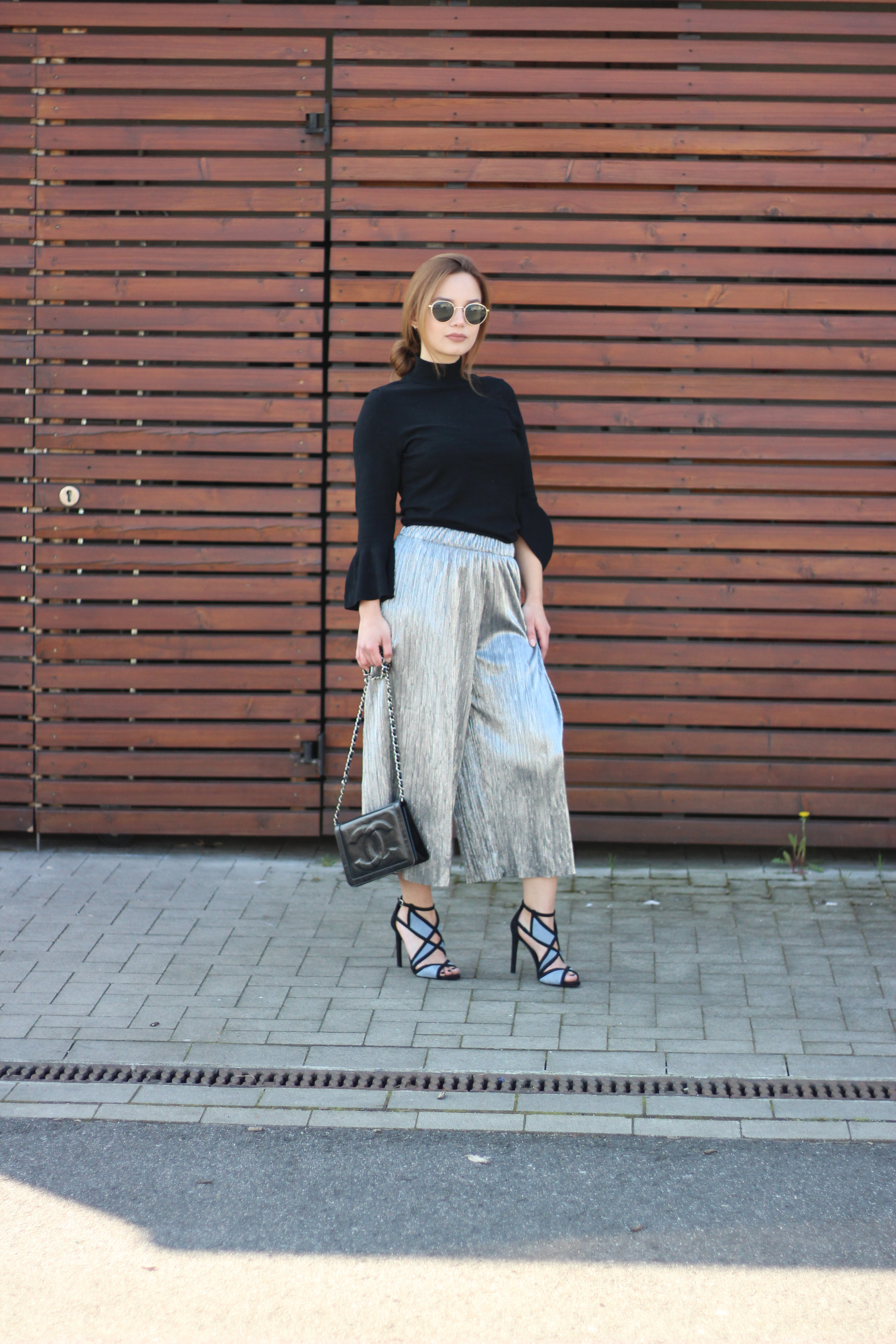 Crew-Member Nesrin zeigt, wie man den raffinierten Metallic-Look stilvoll kombiniert. Zu ihrer auffälligen Plissee-Culotte in Silber wählt sie ein schlichtes, schwarzes Turtleneck-Top mit Volant-Ärmeln. Die geometrischen Cut-out-Heels und ihre Chanel-Clutch verleihen dem Look moderne Extravaganz.