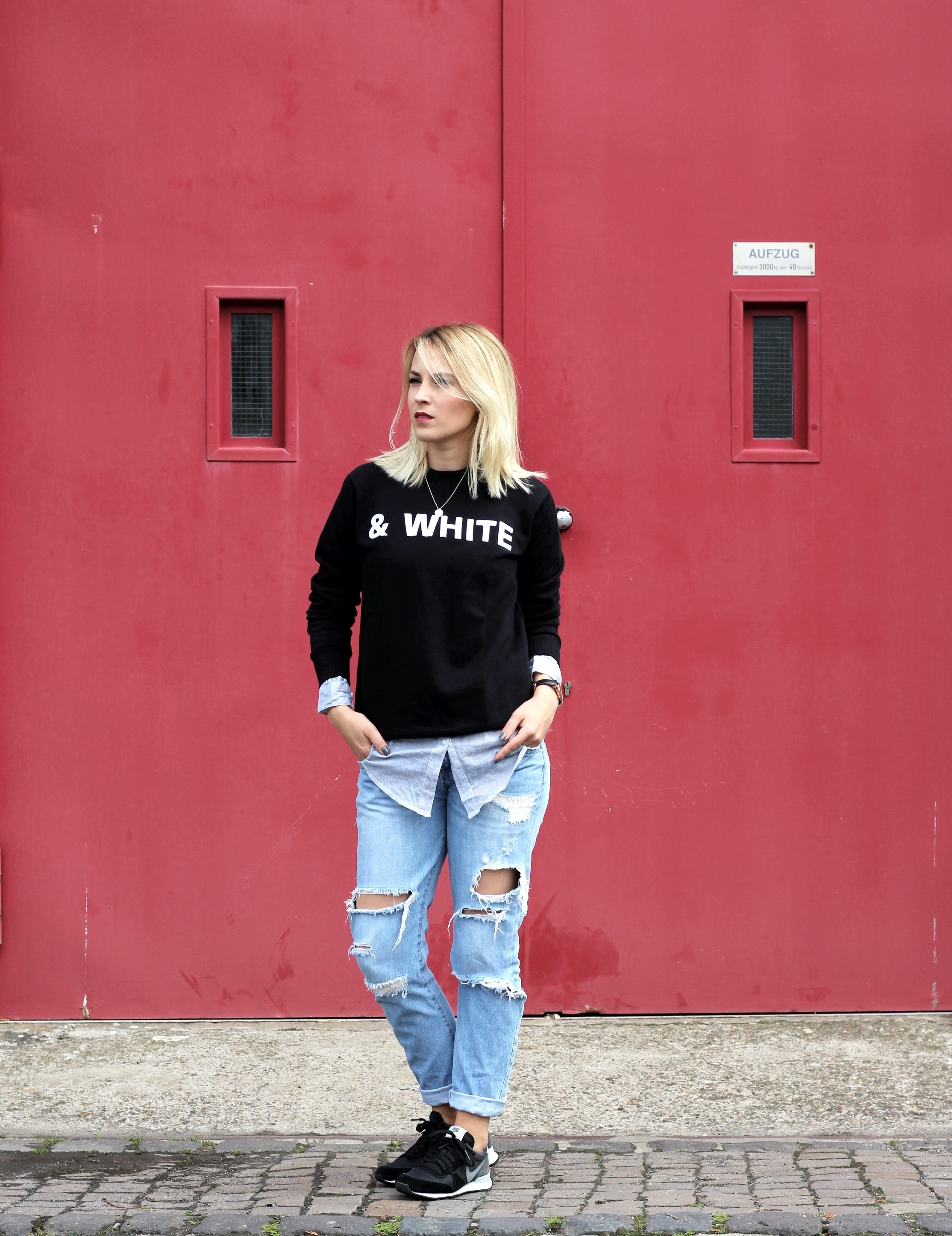 Das Outfit von Redakteurin Julia ist bequem, modisch und total lässig. Ihr wollt es nachstylen? Dafür braucht ihr nicht mehr als einen bequemen Sweater mit coolem Print und eine zerrissene Boyfriendjeans. Die Nike Internationalists komplettieren den Look, die süße Kette und der rote Lippenstift setzen edle Akzente.