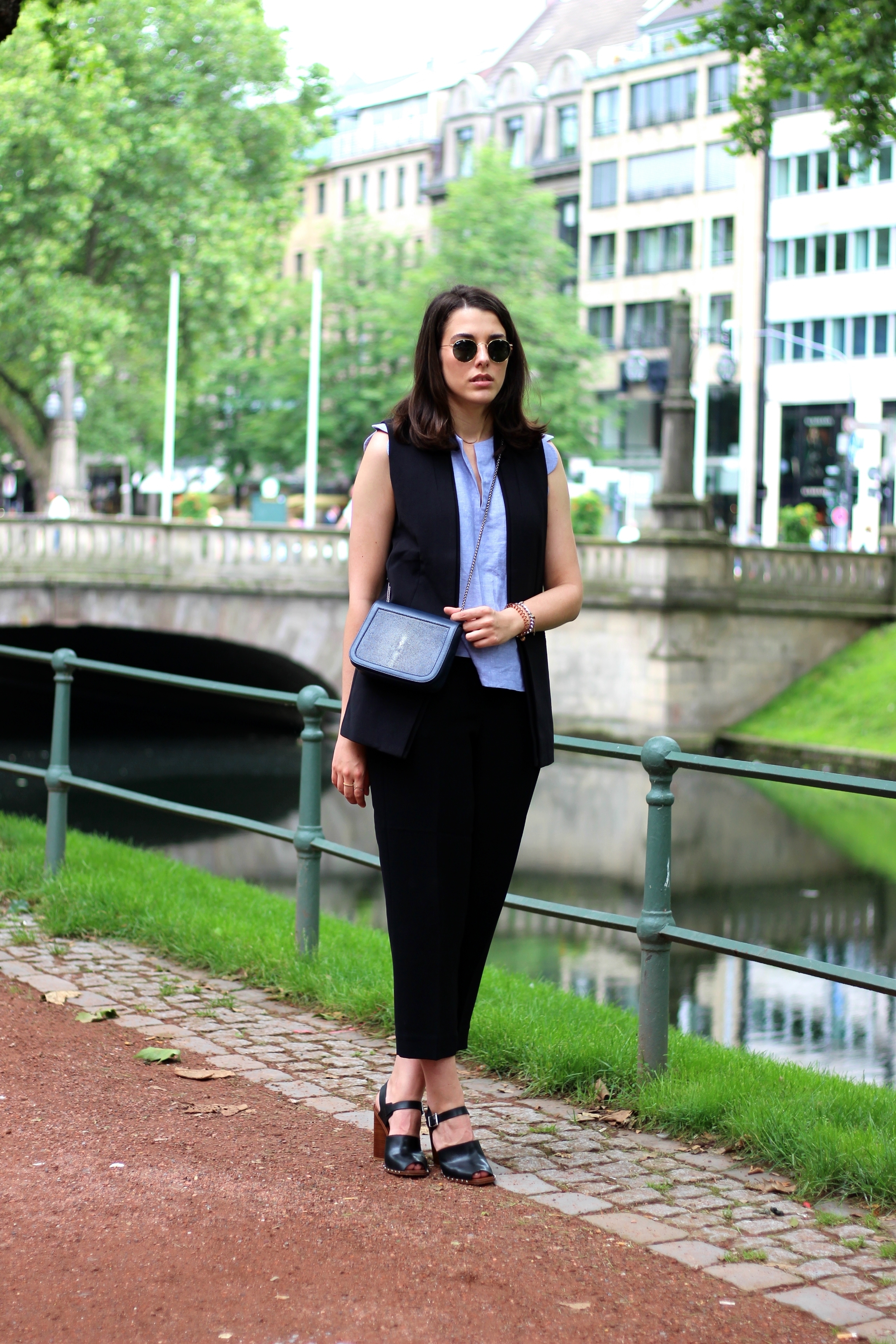 Chic durch Düsseldorf: styleranking Crew-Member Maria zeigt, dass weniger oft mehr ist! Die schwarze Weste wirkt zu Culottes sehr klassisch. Dazu setzt sie mit einer hellblauen Bluse und einer dunkelblauen Umhängetasche von Lili Radu farbliche Akzente. Zu den Kleidungsstücken kombiniert Maria feminine Pantoletten aus schwarzem Leder, die mit Nieten verziert sind. Dem Look verleiht sie damit die nötige Eleganz und ein bischen mehr Pepp! Für eine lässige Erscheinung sorgt die runde, hippe Ray Ban-Sonnebrille. Mit Schmuckstücken hält sie sich zurück und trägt lediglich feine Ringe in Gold und ein zartes Armband. Mit ihrem Look zieht sie die Blicke auf der Königsallee magisch an!