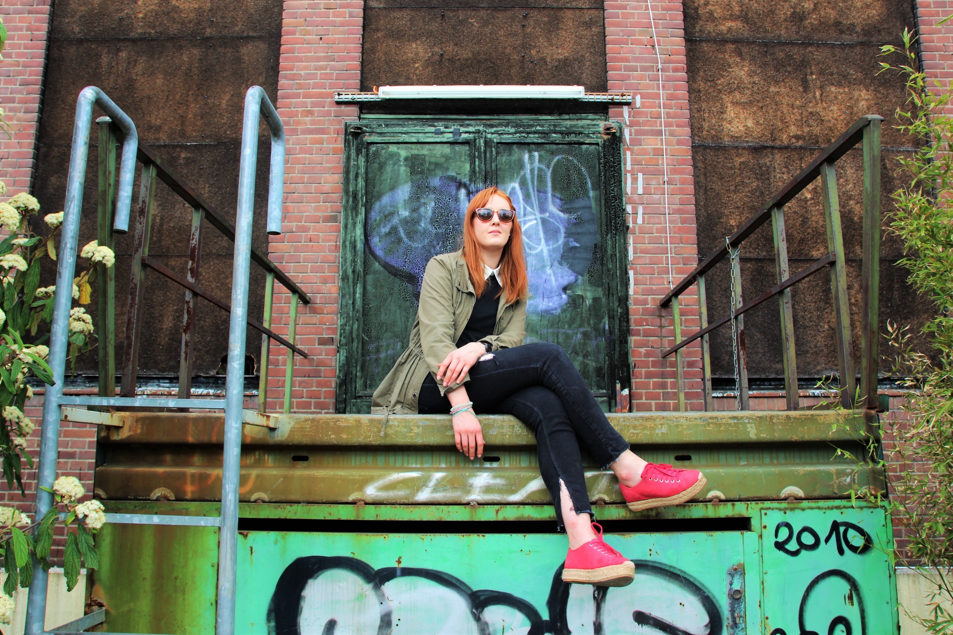 Wie peppt man einen stilsicheren, simplen Alltagslook gekonnt auf? Redakteurin Kristina weiß genau, dass Accessoires das A und O für einen perfekt gestylten Look sind. Deshalb kombiniert sie zur klassischen Military-Jacke und schwarzen Basics knallrote Schnürer mit Bastsohle und einer farblich abgestimmten Sonnenbrille. Ein paar lässige Armbänder im kontrastigen Türkis dazu - fertig!