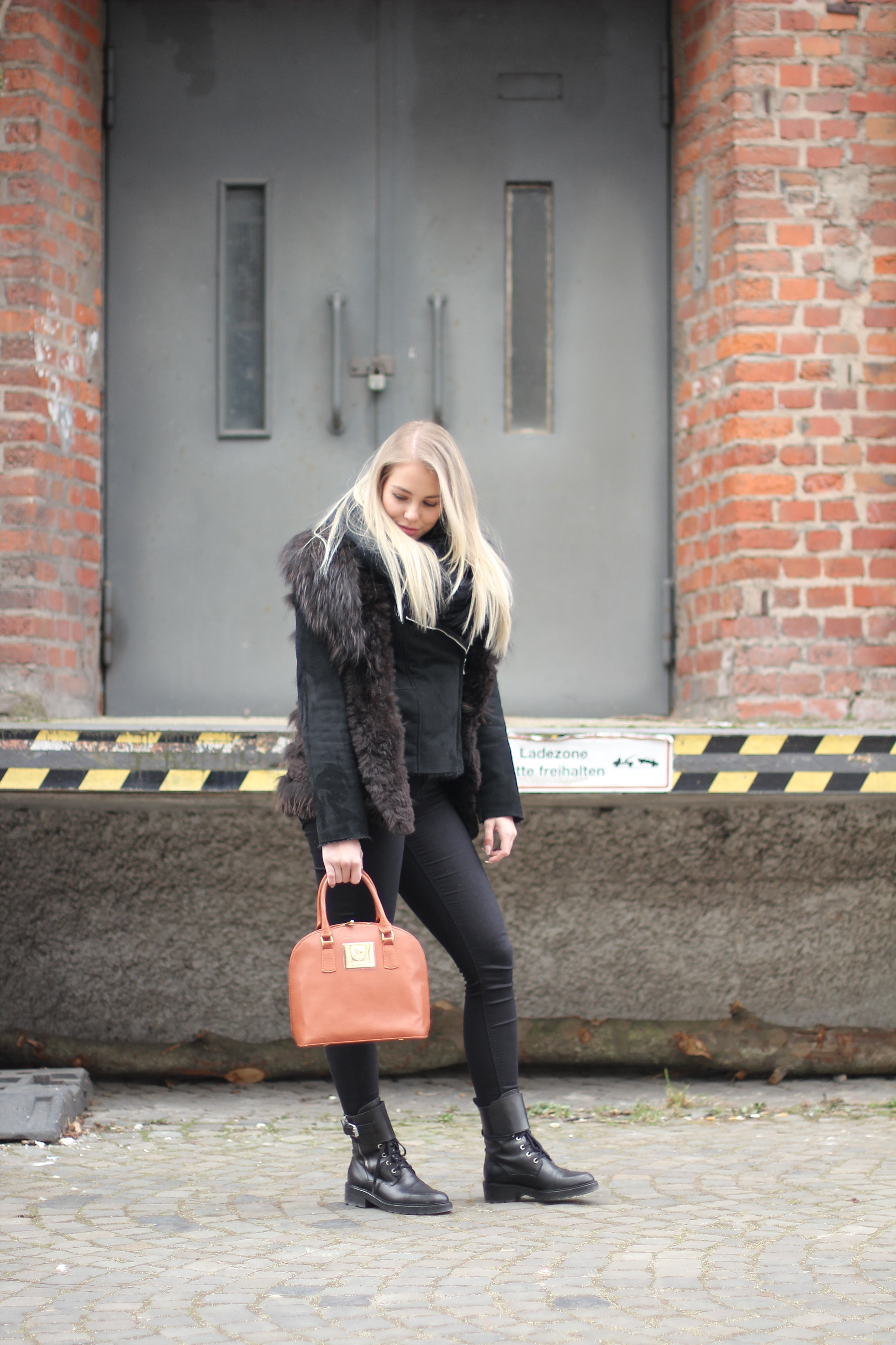 Crew Member Sophie liebt auffällige Farben. Sie trägt einen knallroten Fake Fur Mantel zur schwarzen Skinny Jeans und derben Boots. Die Sashino Tasche rundet ihren Look perfekt ab.