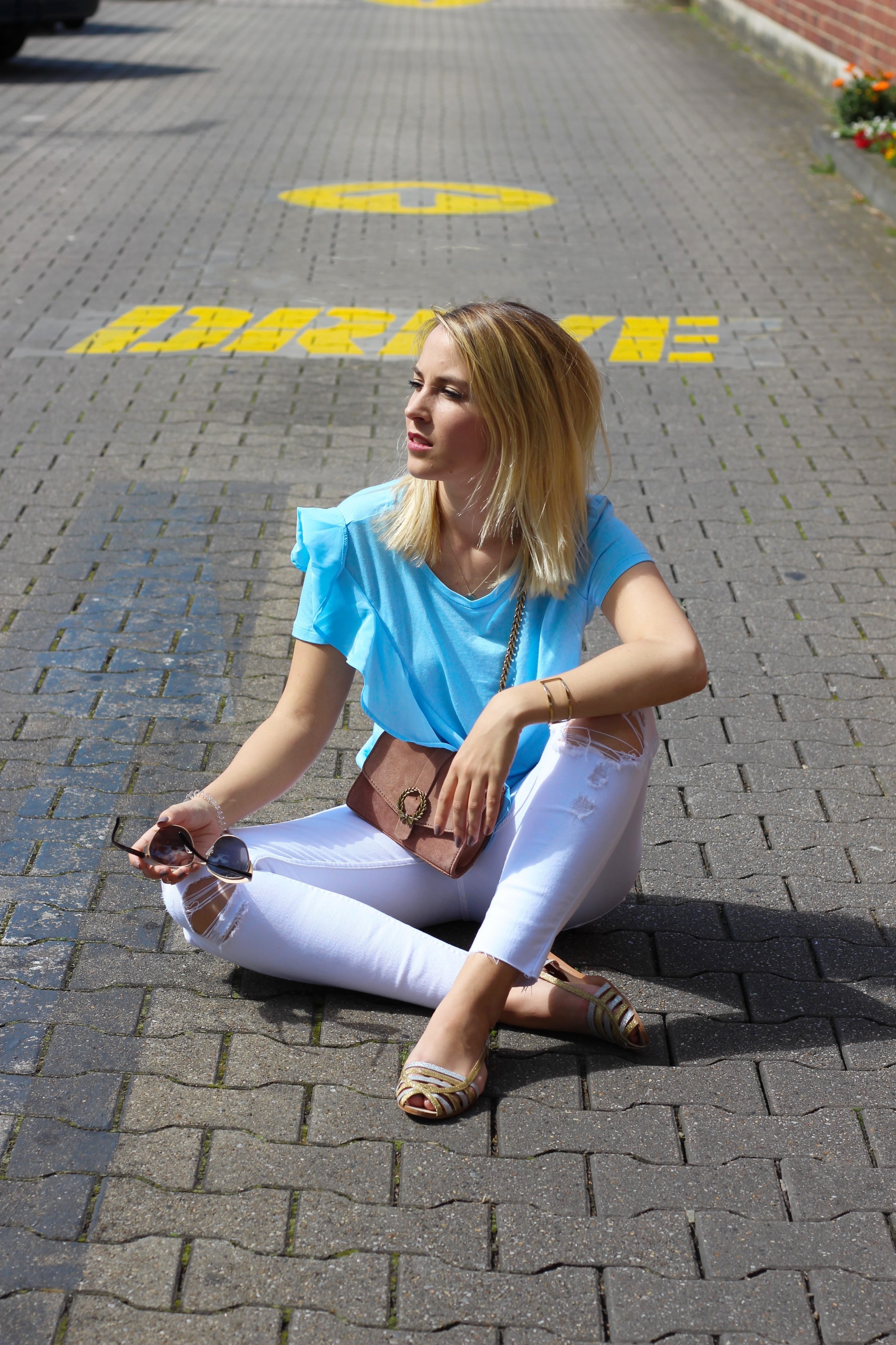 Sommer, Sonne, Sonnenschein: Der schöne Look von styleranking Crew-Member Julia passt zu einem strahlenden Urlaubstag! Das Oberteil im dominanten Blau erinnert uns an türkises Meereswasser. Das Volant am T-Shirt weht mit dem Wind. Die Umhängetasche in Altrosa ergänzt den Blauton des Oberteils. Dazu kombiniert Julia eine weiße Skinny-Jeans im Used-Look, die das Outfit zusätzlich aufhellt. Die eleganten Sandalen in Beige und Türkis passen sich super dem Gesamtoutfit an. Ein chicer Everyday-Look, der ein absoluter Hingucker ist.