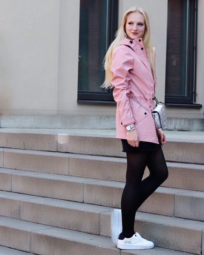Regenmäntel sind diese Saison total angesagt. Vor allem in Pastelltönen oder komplett transparent. Crew Member Sophie trägt eine Variante in Rosa und kombiniert dazu coole Sneaker und silberne Details.