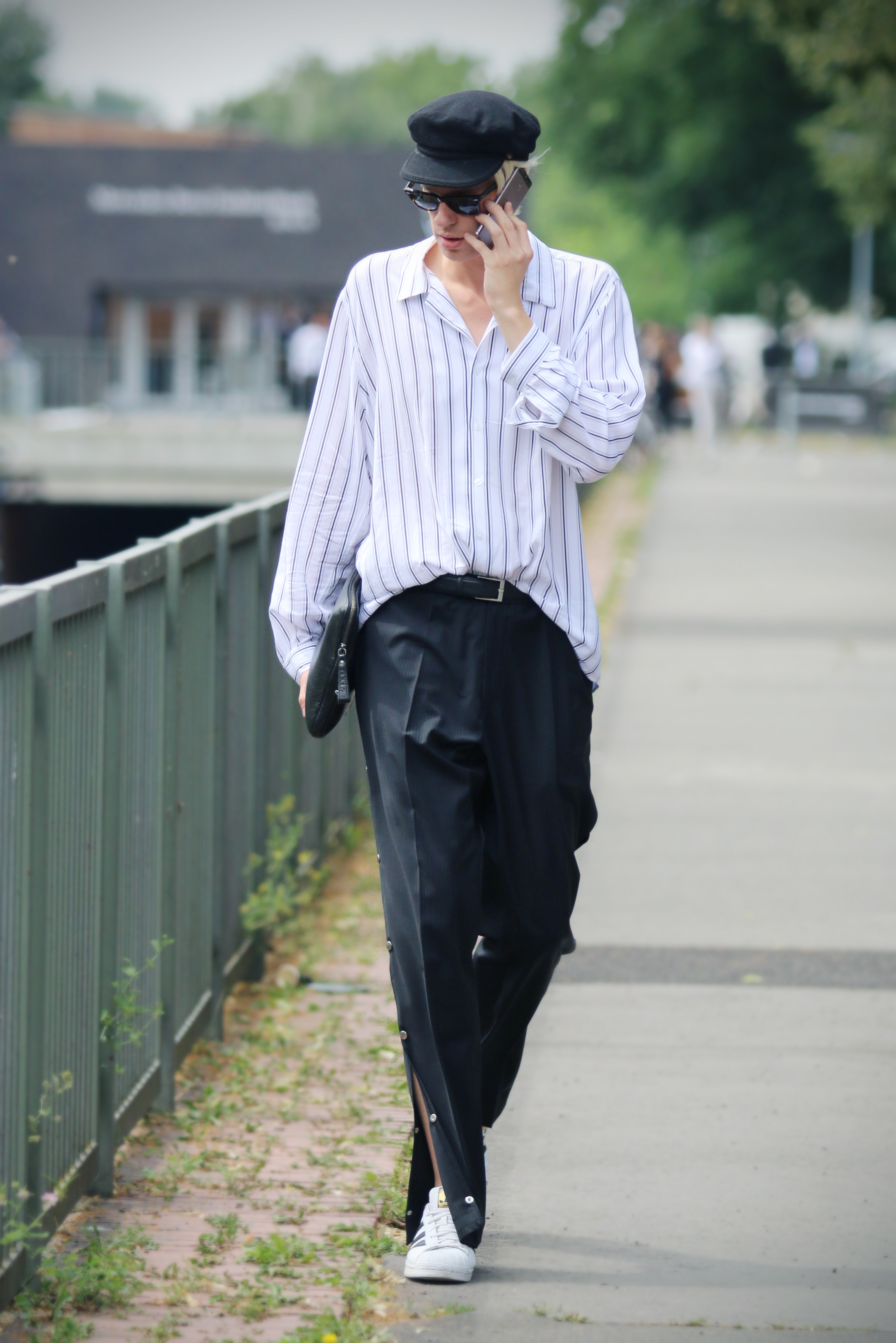 Der "black and white"-Look bleibt weiterhin ultra beliebt - vor allem bei Modemenschen. Redakteur Moritz beweist in Sachen monochrome Outfits ein Gespür und Händchen für Stoffe und Schnitte. Bluse und Hose sind oversized und fallen entspannt um seinen Körper. Knöpfe aus silber an den Hosenbeinen werten den Look auf. Edgy und modern wirkt das Gesamtbild erst dadurch, dass Moritz Accessoirestechnisch auf eine Fiddler-Mütze und Clutch setzt. Die Adidas Superstars verleihen dem edlen Look einen Touch, der durch die sportliche Hose mit Knopfleiste engültig gebrochen wird.