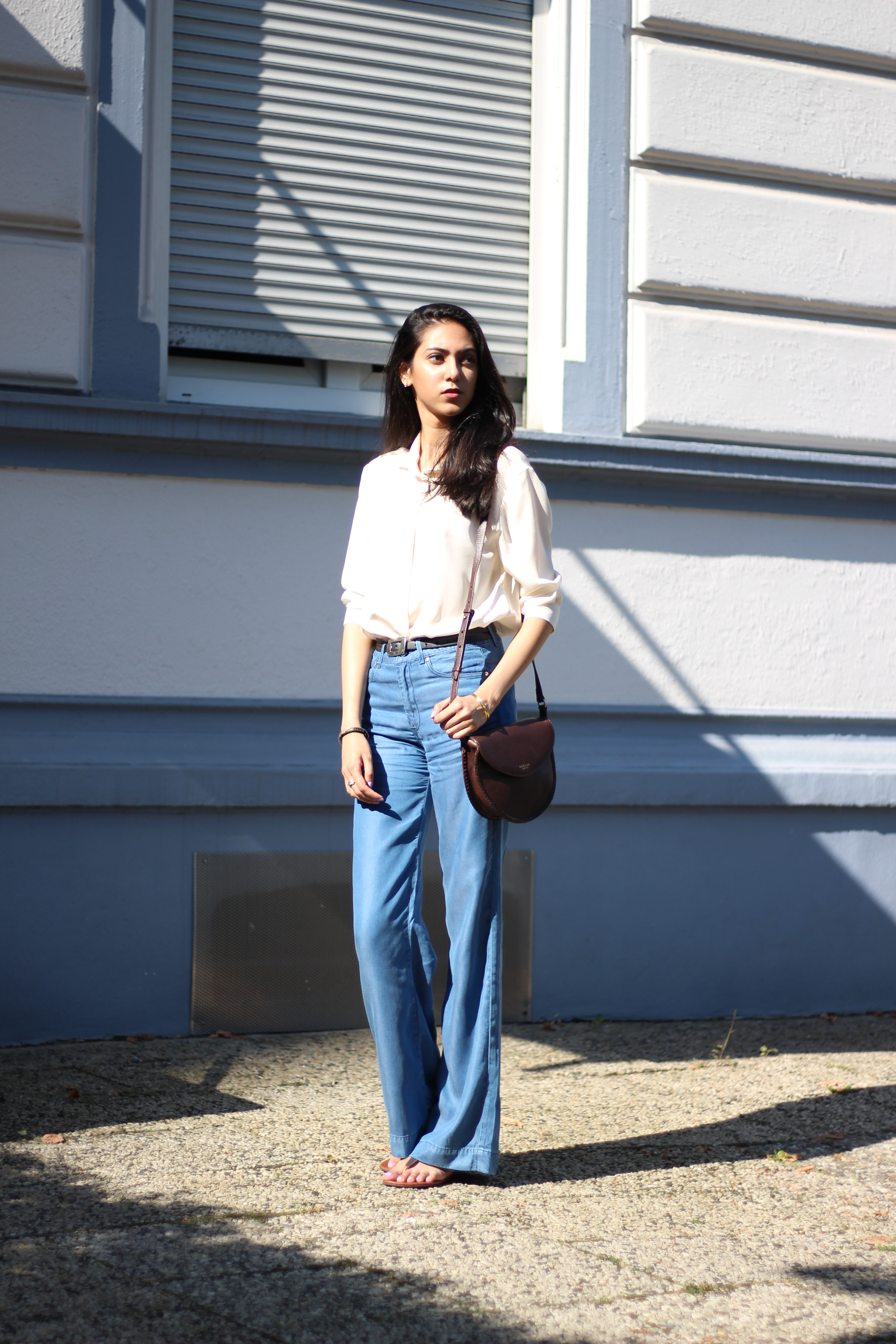 Redakteurin Julia führt ihre Lieblingsbluse aus: Leicht ausgestellte Ärmel und ein zartes Blumenmuster machen das Teil zum Hippie-Favoriten. Die Vintage-Jeans und braune Fransensandalen mit Blockabsatz im 70s-Style machen den Look komplett.