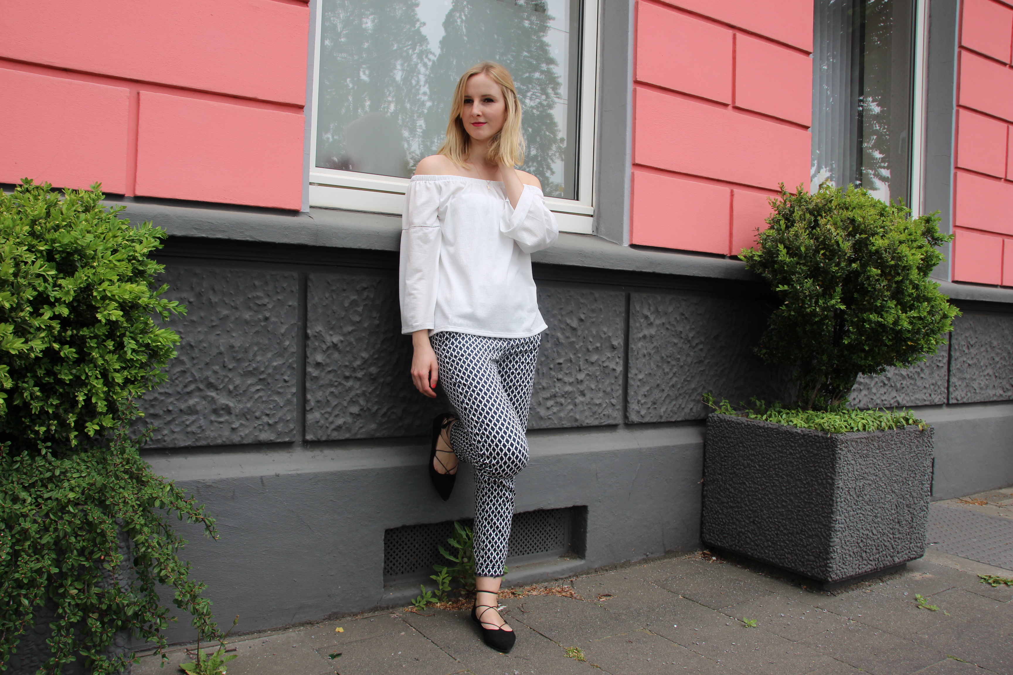 Simple and chic: Isabell verzaubert mit ihrem märchenhaften Look. Gleich drei Must-Haves kombiniert die Moderedakteurin miteinander: Eine weiße Off-Shoulder Bluse, eine gemusterte Hose und schwarze Schnür-Ballerinas. Alle drei Trendteile zeichnen sich durch ihre verspielte Eleganz aus und lassen sich deswegen hervorragend miteinander stylen. Das Tolle an diesem edlen Look? Man kann ihn besonders gut im Alltag tragen. Stets chic aussehen war nie so einfach.