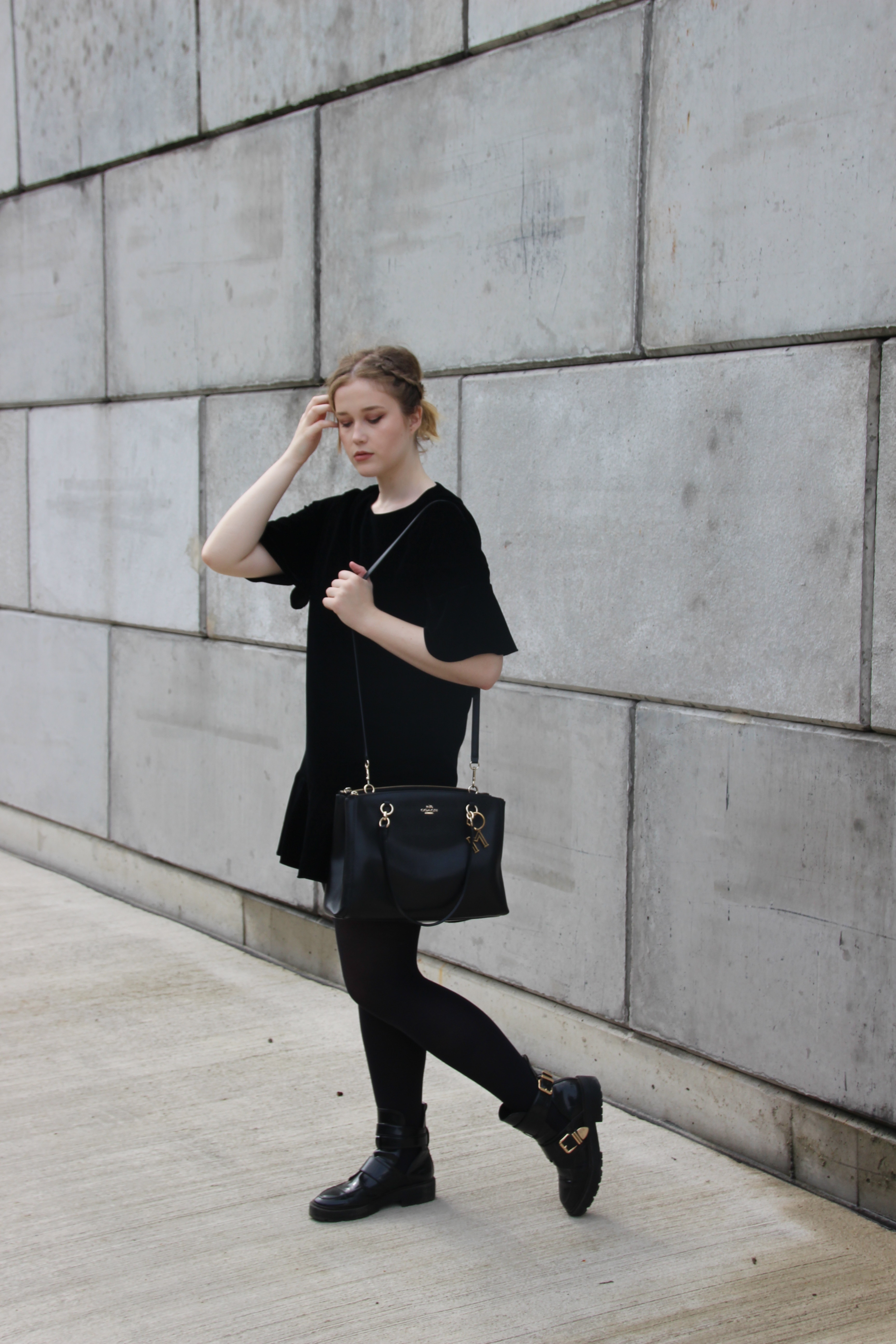 Eine modische Zeitreise in(s) Schwarz(e): Redakteurin Lara liebt die femininen und verspielten Silhouetten der 60er-Jahre und stylt ihr dunkles A-Linien-Kleid zu rockigen, spitzen Stiefeletten. Sie zeigt, wie man vergessen geglaubte Trends neu interpretiert. Lara verzichtet bewusst auf Bonbonfarben und wilde Mustermixe und verlässt sich auf ihre geliebten all black Trendteile. Damit zaubert sie einen coolen und edgy Look, der sich zu jeder Jahreszeit sehen lassen kann. Auf auffälligen Schmuck verzichtet sie komplett.