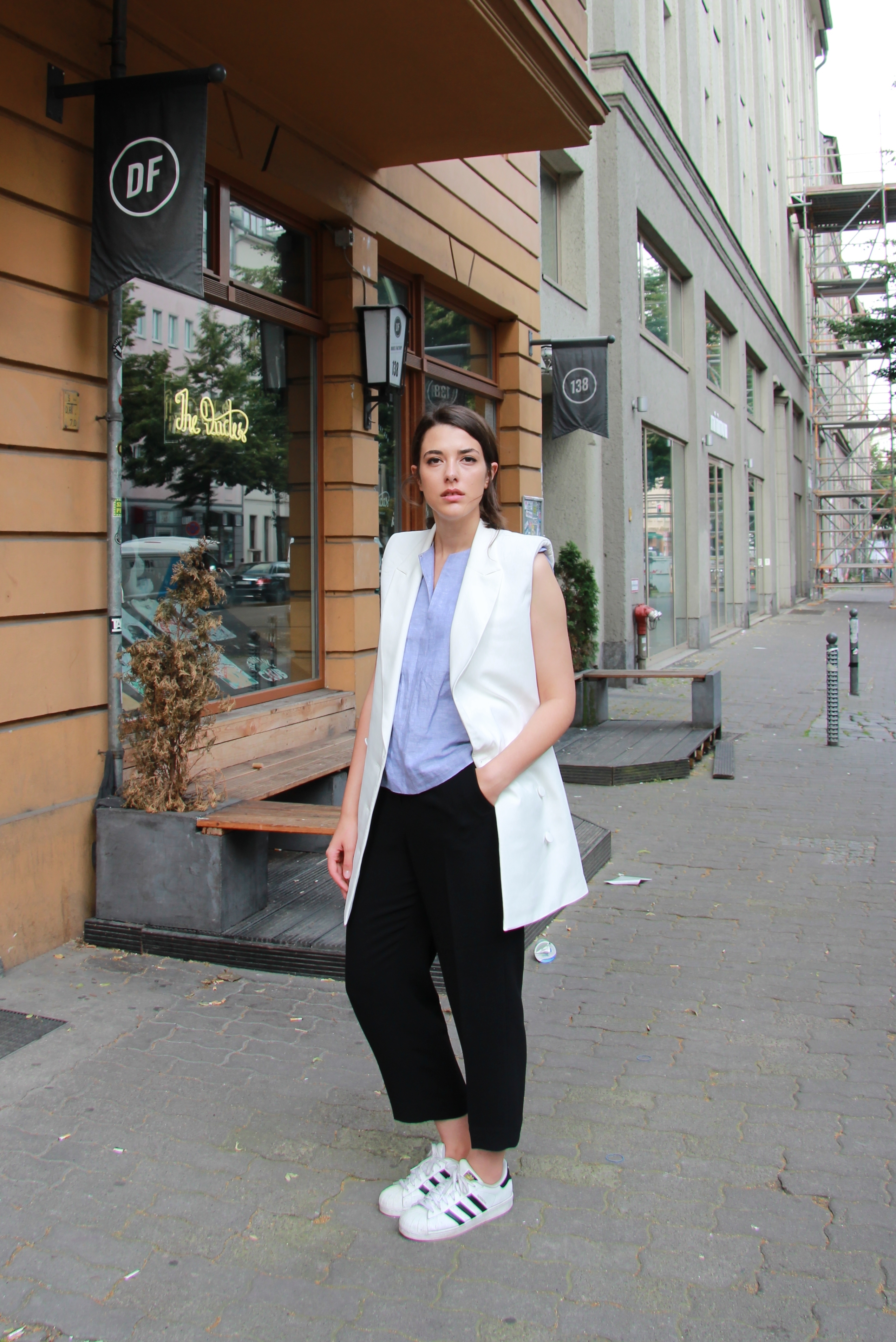 Bei der turbolenten Fashion Week ist ein komfortables und stylishes Outfit gefragt. Mit der Oversize-Business-Hose, einem hellblauem Shirt und dem All-Time-Favourite, der klassischen Trench-Weste, ist Maria top gestylt für Shows und Off-Site-Events. Die Adidas Superstar Sneaker verleihen ihrem Look die nötige Leichtigkeit.
