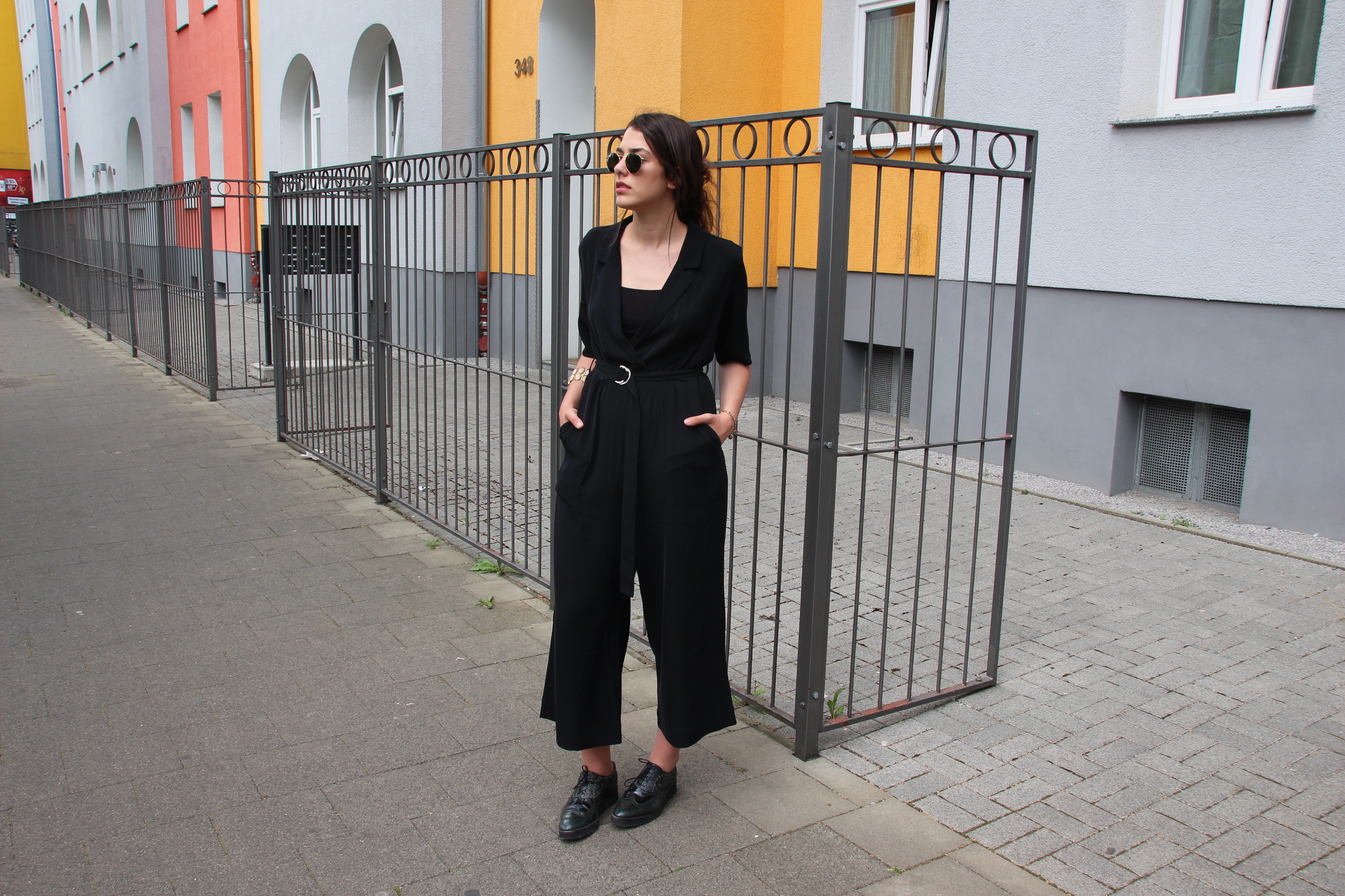 So einfach geht stylish, cool und bequem zugleich: Redakteurin Maria wählt einen schwarzen Culotte-Jumpsuit und vereint damit zwei It-Pieces in einem Teil. Als Schuh wählt sie Budapester, die ihren lässigen Look gemeinsam mit der Sonnenbrille komplettieren. Ihr dezenter Armschmuck passt zu ihrem minimalistischen Look und ist damit genau die richtige Wahl.