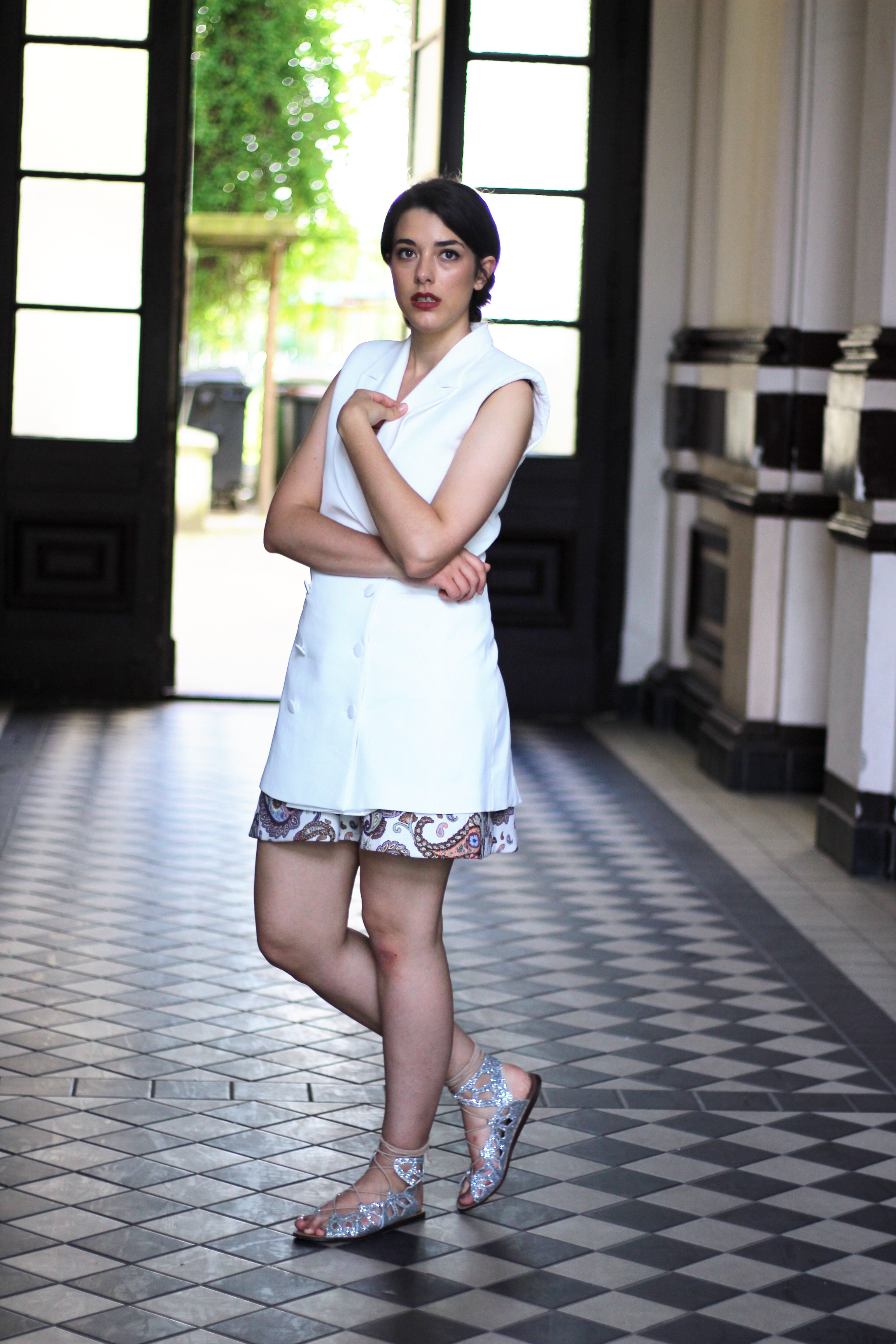Nichts ist schöner als im Sommer helle Farben zu bekennen. Für einen all white everything Look braucht es nicht mehr als eine weiße Weste und einen weißen Rock mit auffälligen Paisley-Muster. Wem das zu gewagt ist, kann unter der Weste ein Bluse oder ein Shirt anziehen. Die Glitzer-Sandalen verleihen dem Look den nötigen Glamour.