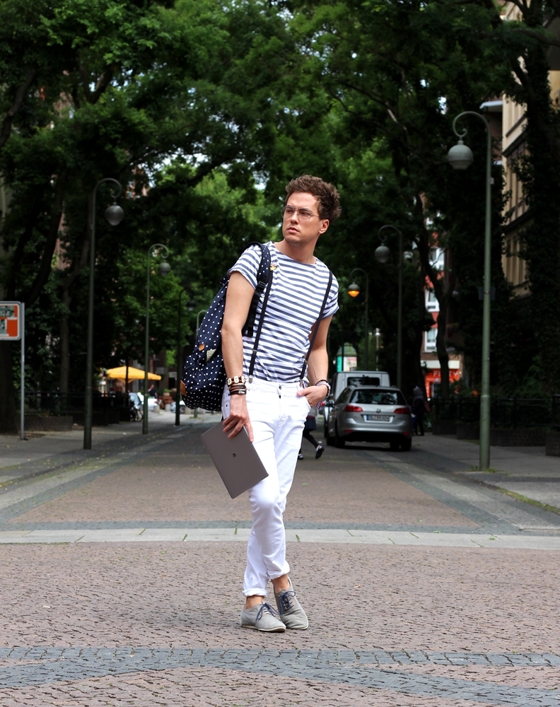 Chefredakteur Daniel setzt in Sachen Streetstyle auf einen maritim angehauchten Look. Das blau-weiß gestreifte Shirt stylt er zu einer weißen Hose und schmalen Hosenträgern. Verspielt wirkt der Look dank des gepunkteten Rucksacks. Er steht im Dessin-Kontrast zum Streifenshirt. Die grauen Stoffschuhe fügen sich unauffällig in das farbliche Gesamtkonzept ein. Ein sommerlich-lässiger Look, den man(n) mit nur wenigen Kniffen nachstylt.