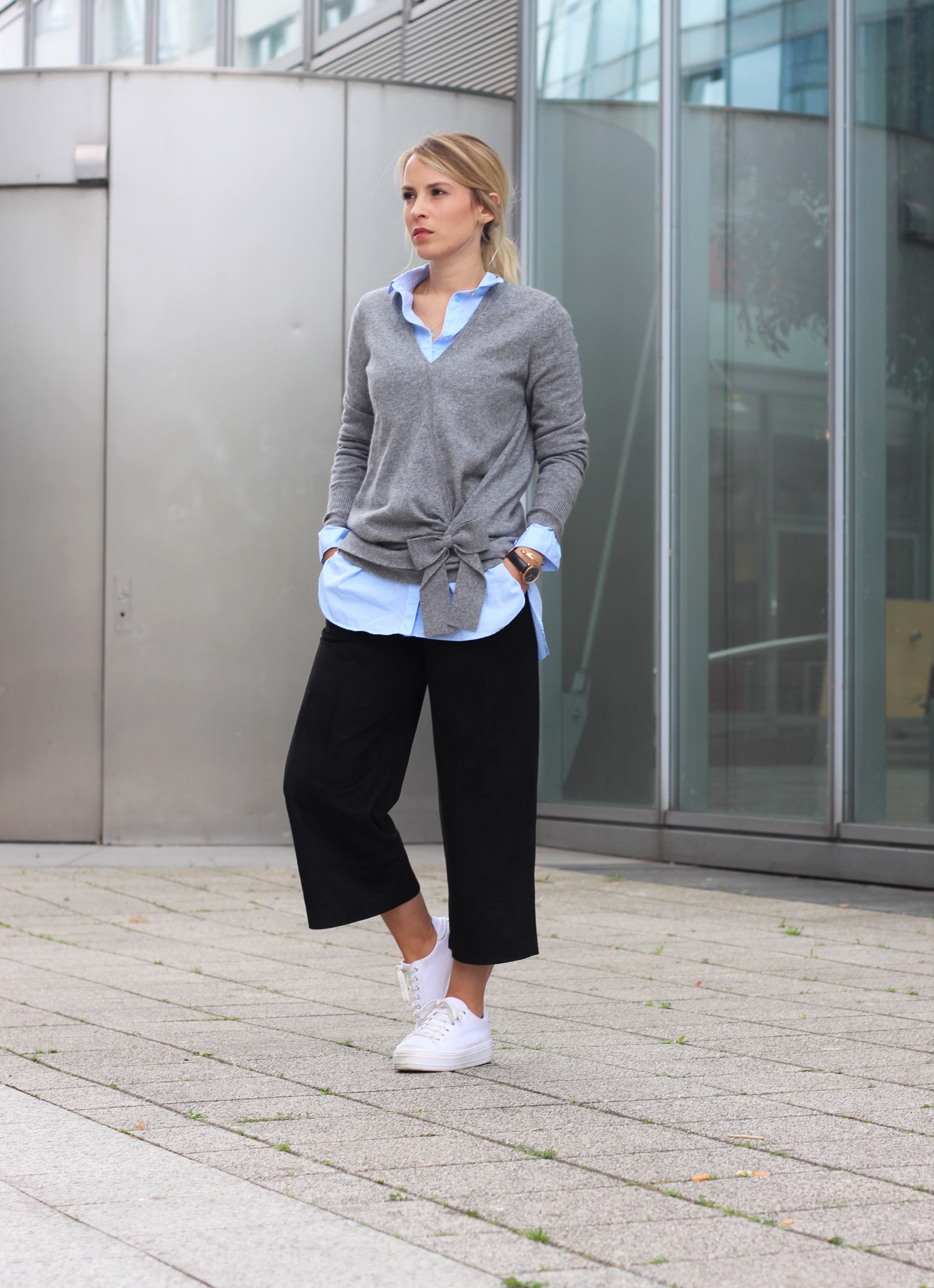 Klassische Looks gehen immer, vor allem im stressigen Alltag. Umso mehr erfreut sich das Auge an verspielten Details, die Leichtigkeit in die Sache bringen. Den Tag versüßt uns der zauberhafte, graue Pullover von Eric Bompard. Eine edle Schleife ziert den eleganten Pullover aus Kaschmir. Diesen stylt Redakteurin Julia mit einem hellblauen Hemd und einer schwarzen Culotte. Sportlich wirkt der Look dank der weißen Sneaker mit Plateauabsatz. Die Armbanduhr aus schwarzem Leder verleiht Julias Outfit schmucktechnisch einen weiteren eleganten Touch.