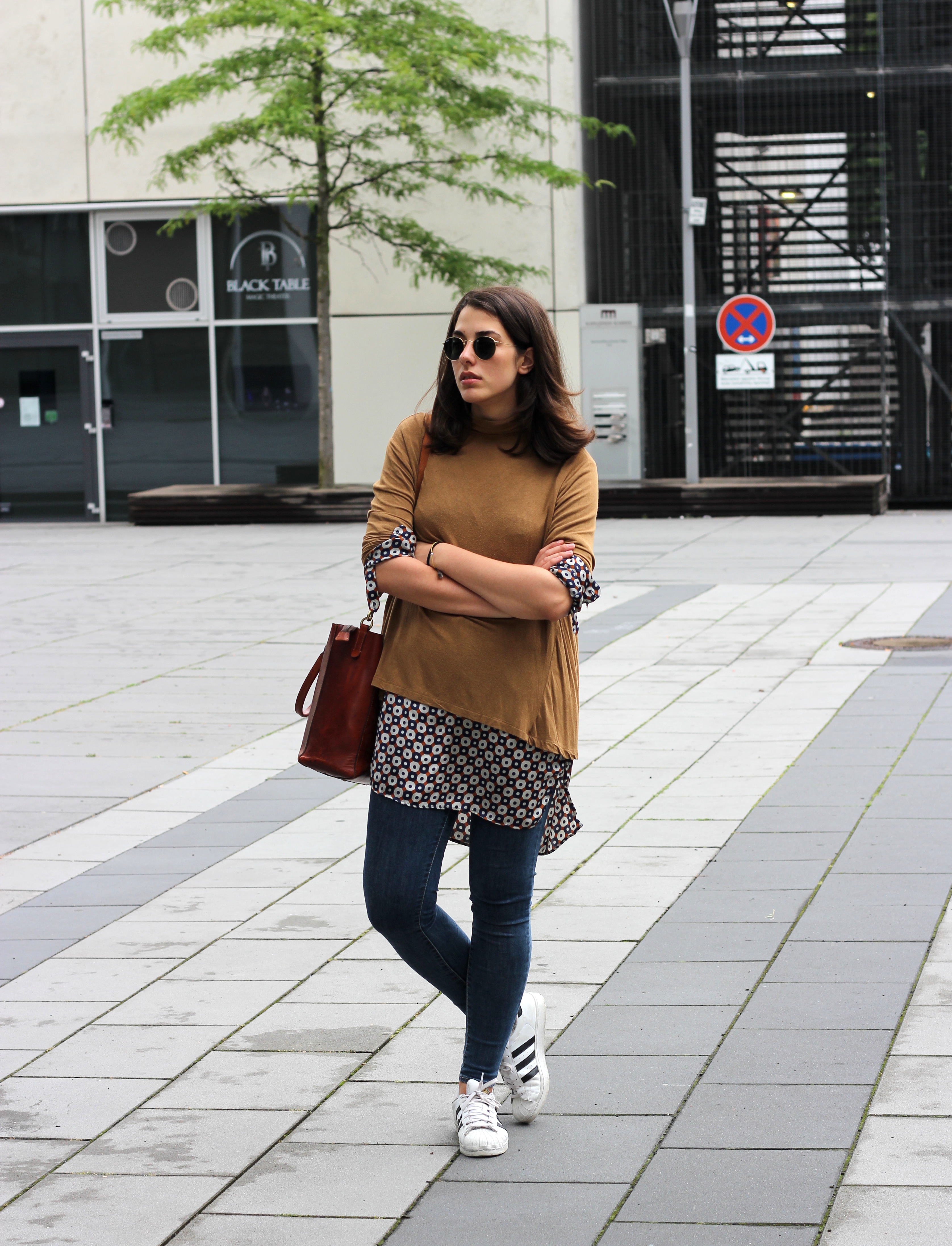 Jede Frau braucht Basics - gar keine Frage. Sei es das weiße T-Shirt oder ein beigefarbener Pulli, den man zu jeder Lebenslage tragen kann. Dennoch wirken Basic-Looks schnell langweilig, wenn man sie nicht mit aufregenden It-Pieces stylt. Was man tun kann? Auf bunte und auffällige Trendteile wie Blusen, Blazer, Hosen oder Jacken setzen. styleranking Crew-Member Maria vertraut auf ihre bemusterte Seidentunika, die Akzente in ihrem eher simplen Look setzt. Sportlich und lässig wirkt der Look dank Sneaker und runder Sonnenbrille.