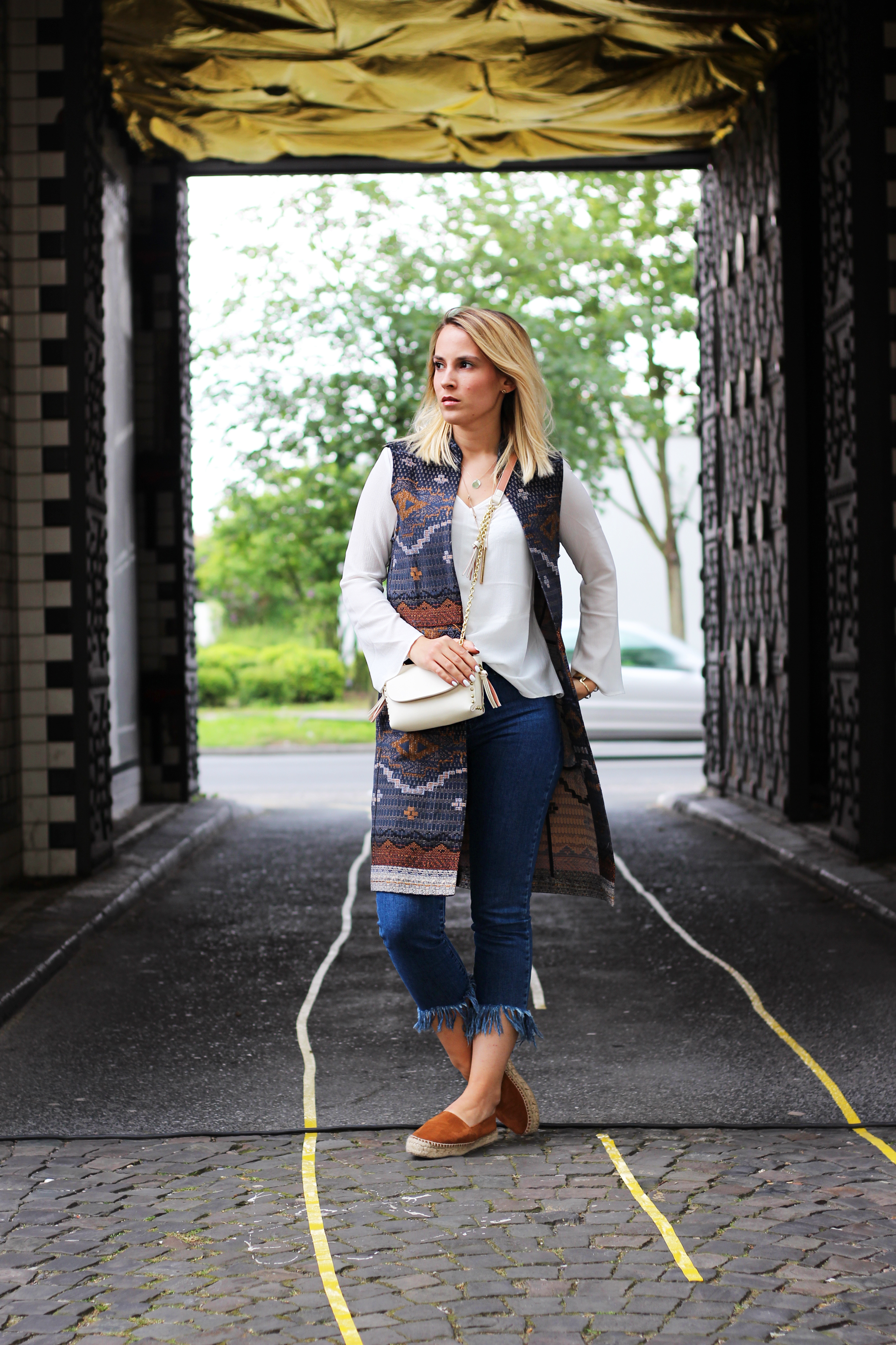 Wilder Muster- und Trendmix: Plötzlich entdeckt man die Frayed Jeans überall. Bei dieser Denimhose handelt es sich um eine normale Jeans, die man so lange an den Knöcheln auseinander zupft, bis sie komplett ausgefranst sind. Redakteurin Julia stylt ihr zerfranstes Trendteil aus Denim mit einer wild bemusterten XXL Weste. Passend dazu trägt sie ihre camelfarbenen Espadrilles. Bluse und Tasche hält sie in Weiß und Beige - die passenden Gegenstücke zu den Eyecatchern Musterweste und Frayed Jeans.