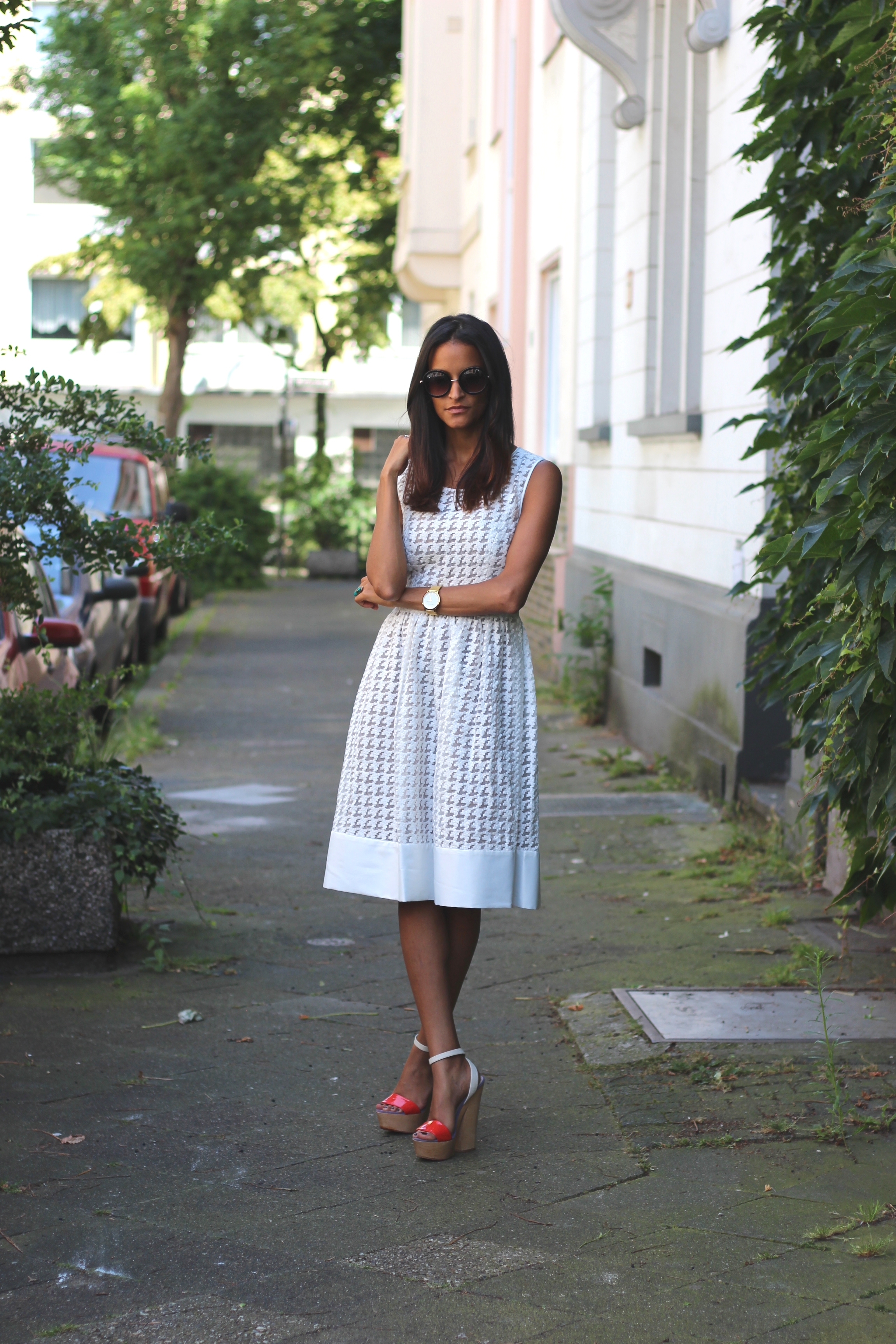 Marion zaubert uns mit ihrem süßen Sommerstyle direkt ein Lächeln ins Gesicht. Das weiße Spitzenkleid von Madeleine kombiniert sie mit stylischen Wedges in einem auffälligen Orange in Lackoptik. Dazu trägt sie eine coole Sonnenbrille, die das Outfit perfekt komplettiert. Der Sommer kann also kommen!