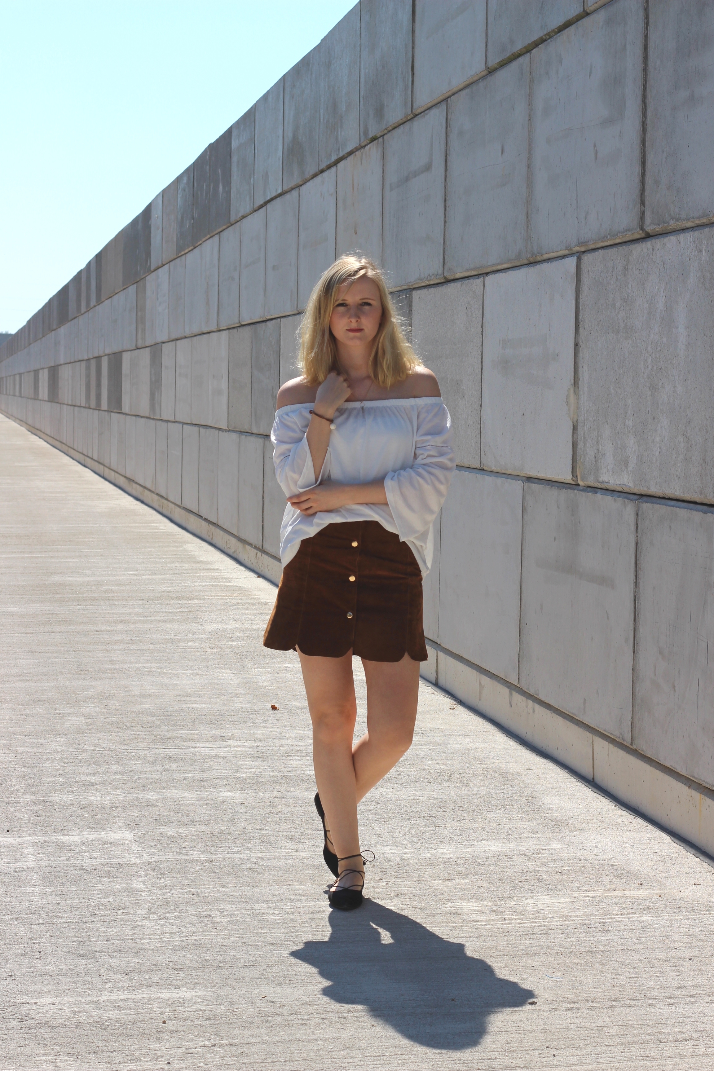 The 70's are back! styleranking-Crew Member Isabell trägt an heißen Sommertagen einen coolen Minirock in Wildlederoptik und dekorativer Button Down-Knopfleiste. Das Tolle an dem It-Piece im 70er Jahre Stil? Es ist süß und sexy zugleich. Zu dem Rock kombiniert Isabell eine luftige Off-Shoulder Bluse und schwarze Lace-Up Ballerinas. Wem das Outfit zu süß ist, kann alternativ auf ein T-Shirt und Chucks zurückgreifen.